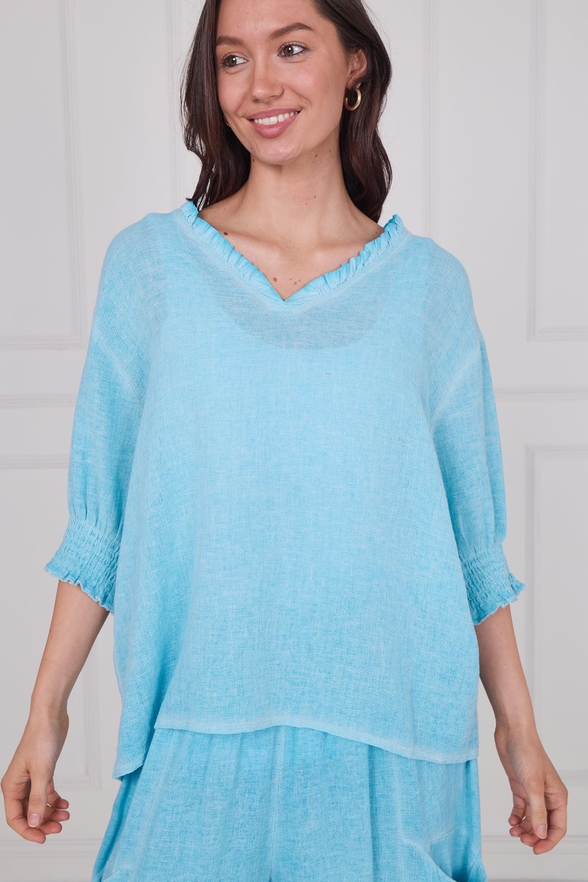 Embrace effortless elegance with our Washed Linen Frill V-Neck Shirred Sleeve Top. Crafted from premium, soft washed linen, this top combines a relaxed, breathable fit with a touch of feminine charm. The frill detail around the V-neckline adds a playful, yet sophisticated flair, while the shirred sleeves provide a soft, gathered effect for a flattering silhouette.