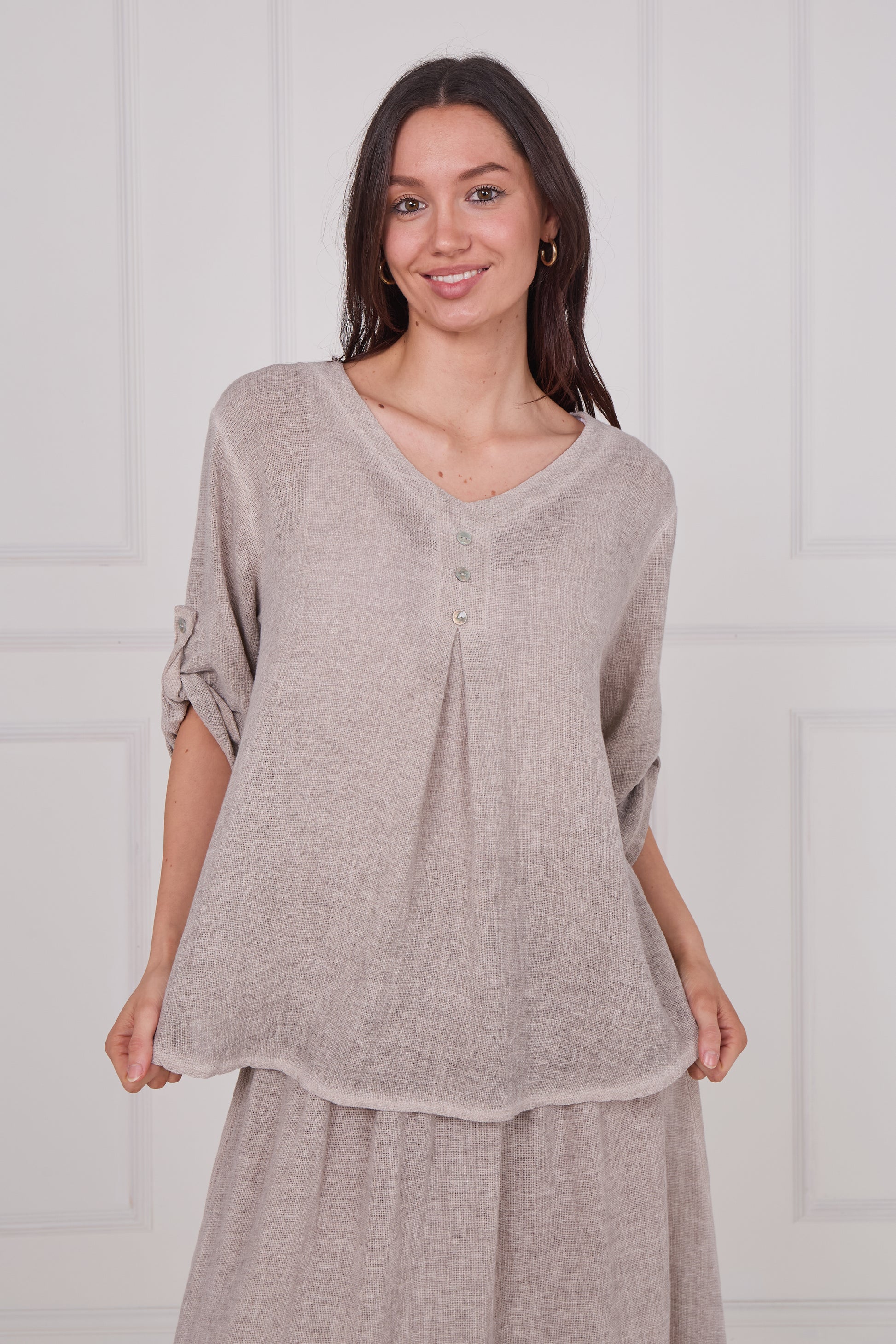 Embrace effortless elegance with our Washed Linen Three Buttoned Sleeve V-Neck Top. Crafted from premium, soft washed linen, this lightweight piece offers a breathable, relaxed fit ideal for warm-weather and transitional styling. The flattering V-neckline is complemented by buttoned sleeve detailing, adding a subtle design feature to this easy, everyday silhouette.