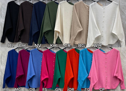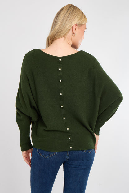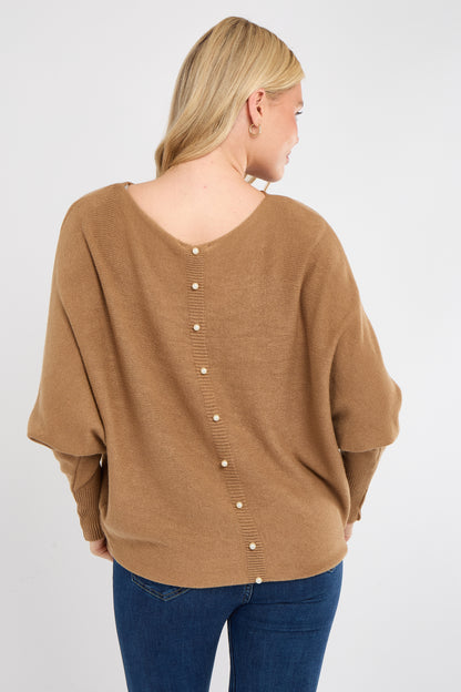 Add a touch of elegance to your everyday wardrobe with our Pearl Back Jumper. This sophisticated knit features a classic front silhouette with a surprise statement at the back — a delicate row of faux pearl buttons that add charm and femininity.