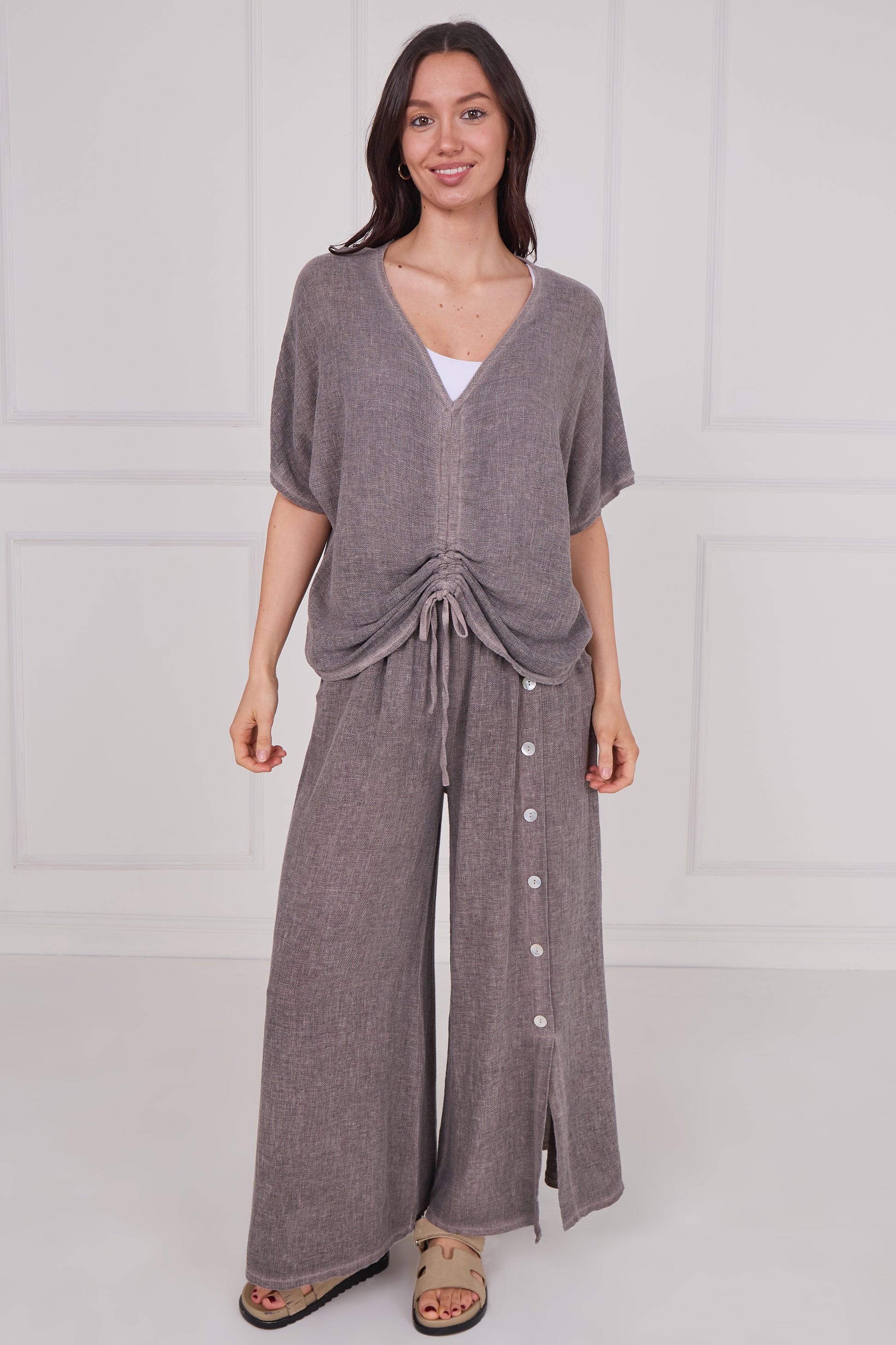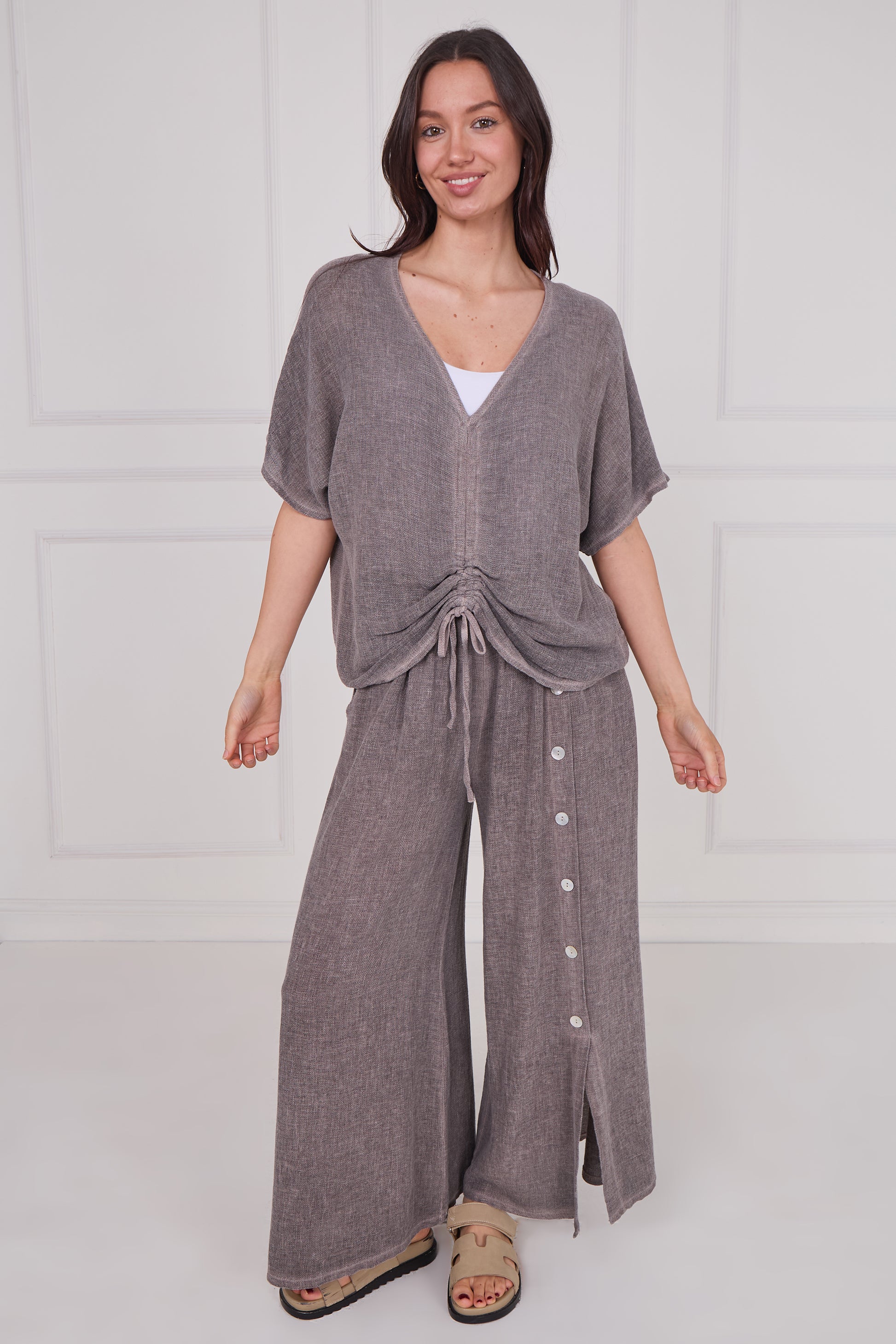 Elevate your wardrobe with the effortlessly chic Washed Linen Drawstring Ruched Top. Crafted from soft, breathable washed linen, this top combines comfort and style in one perfect piece. The lightweight fabric offers a relaxed fit while maintaining structure, making it ideal for both warm days and layered looks.