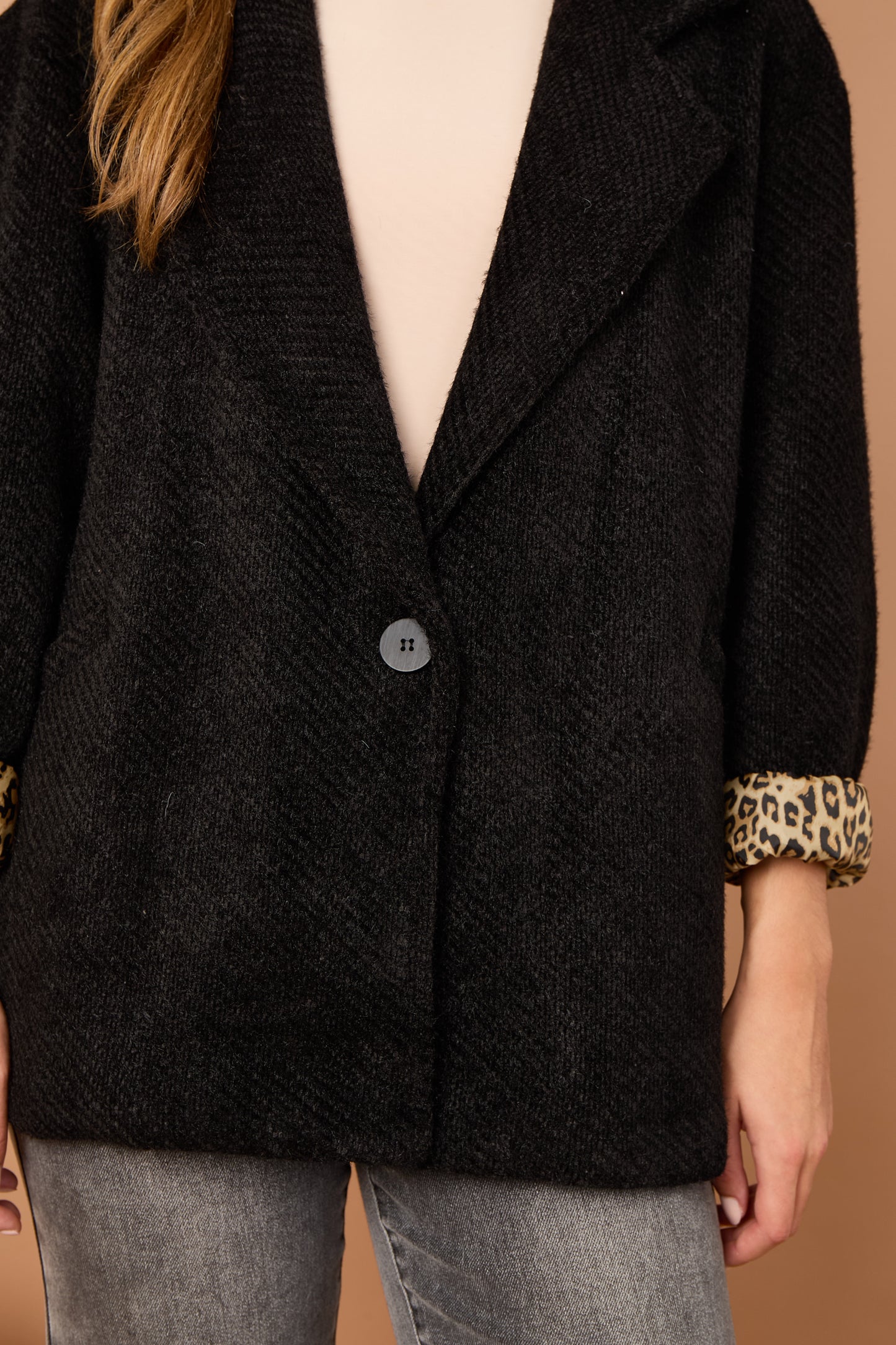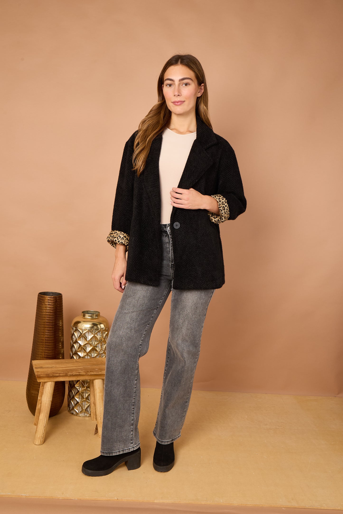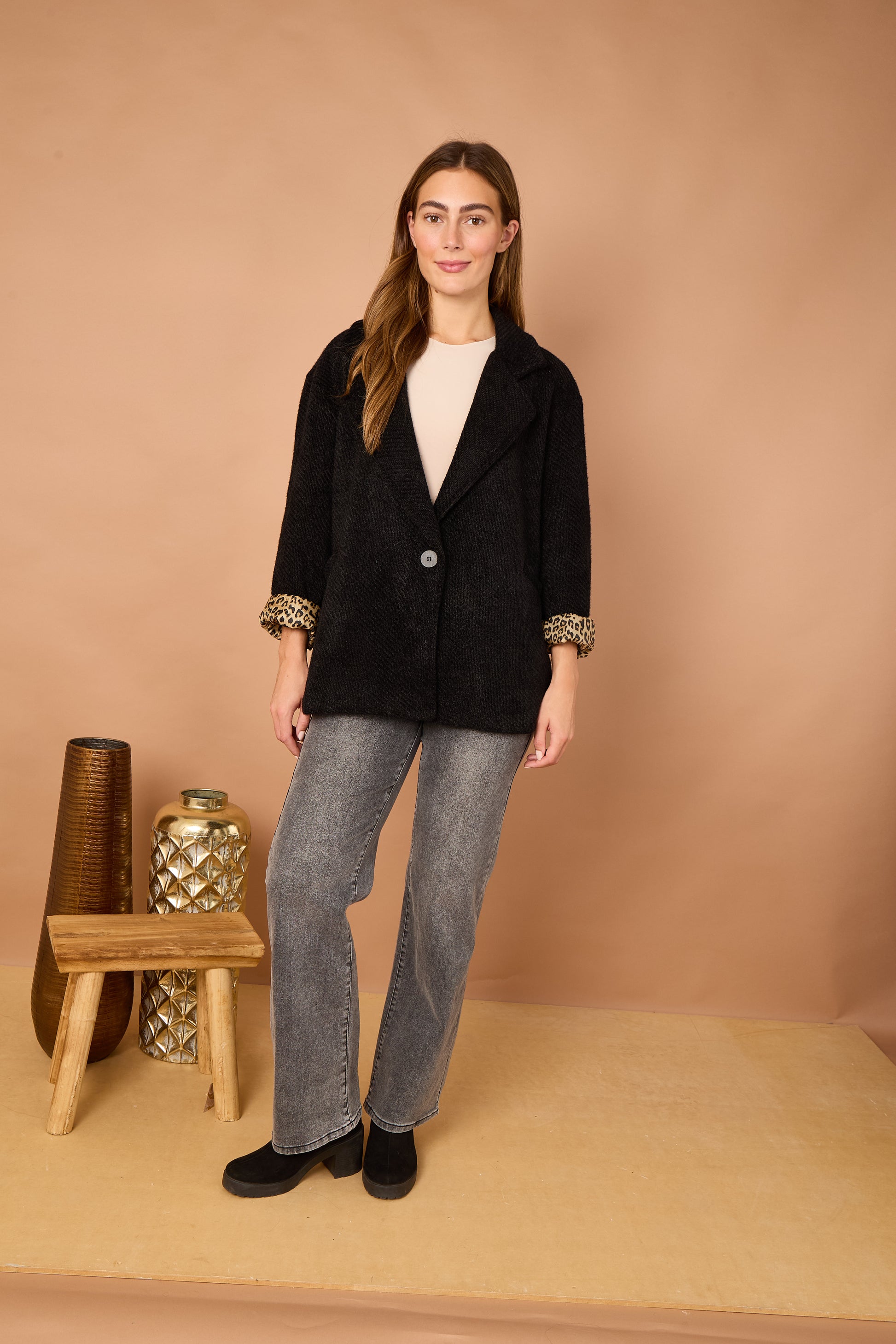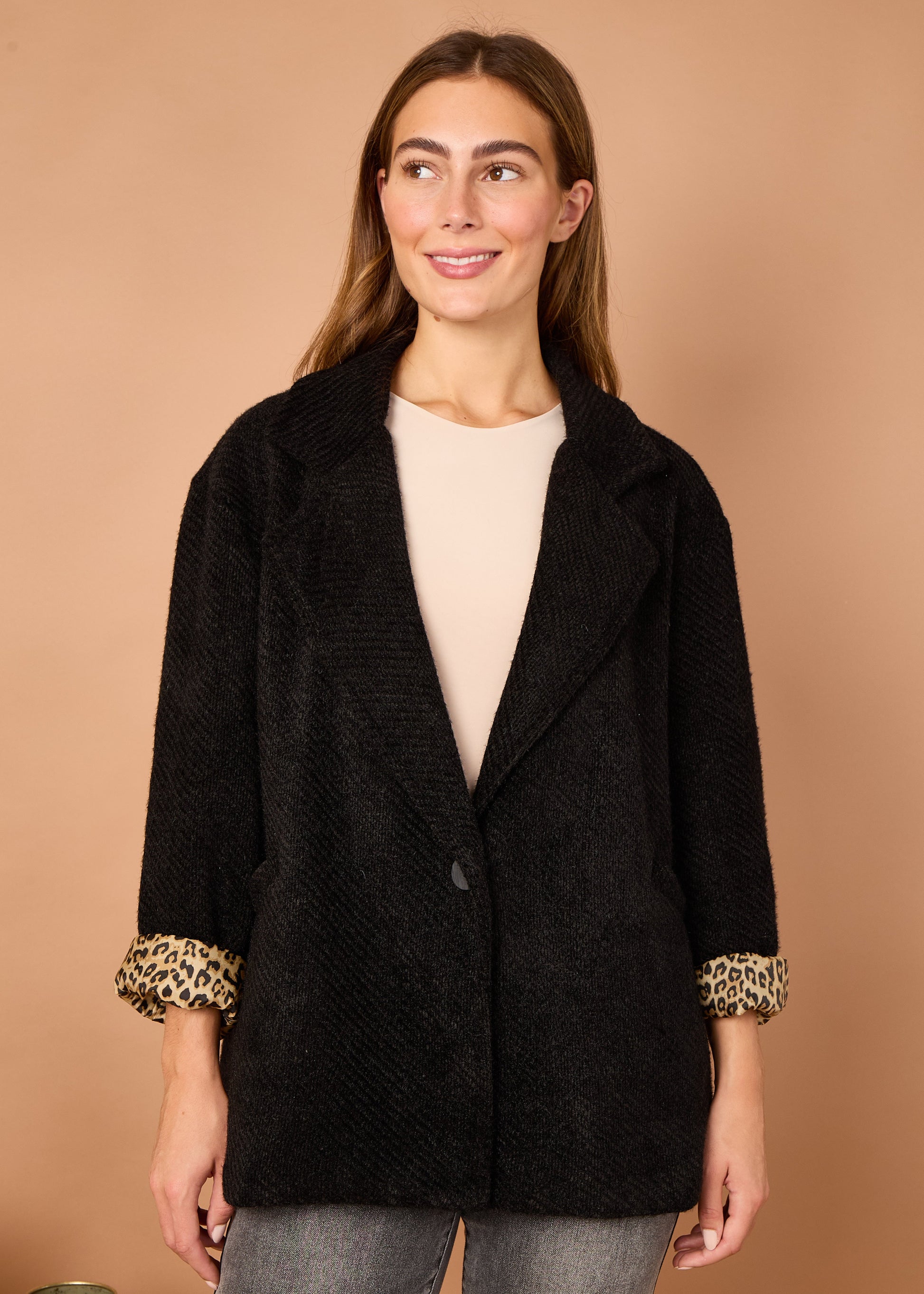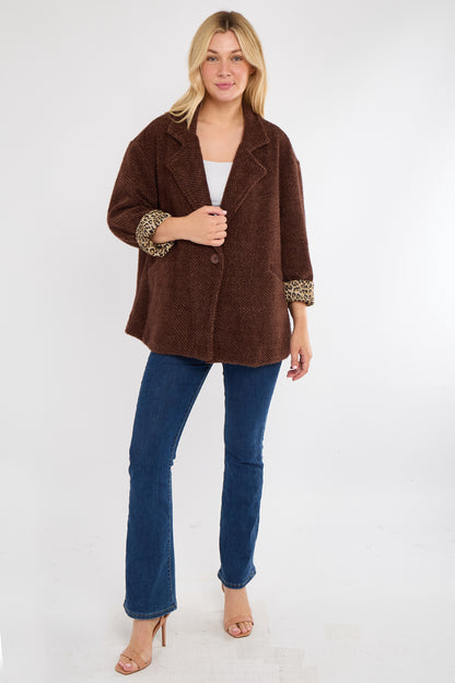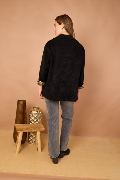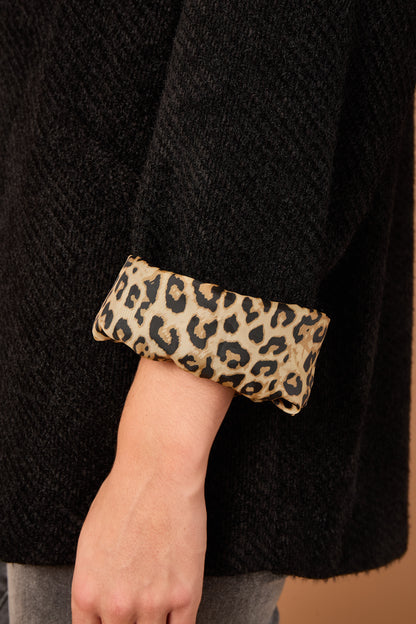 The Leopard Trim Jacket is your new go-to layer for adding instant edge to any outfit. Designed in a timeless silhouette, this jacket features sleek lines, a flattering fit, and standout leopard print accents that bring just the right amount of drama.