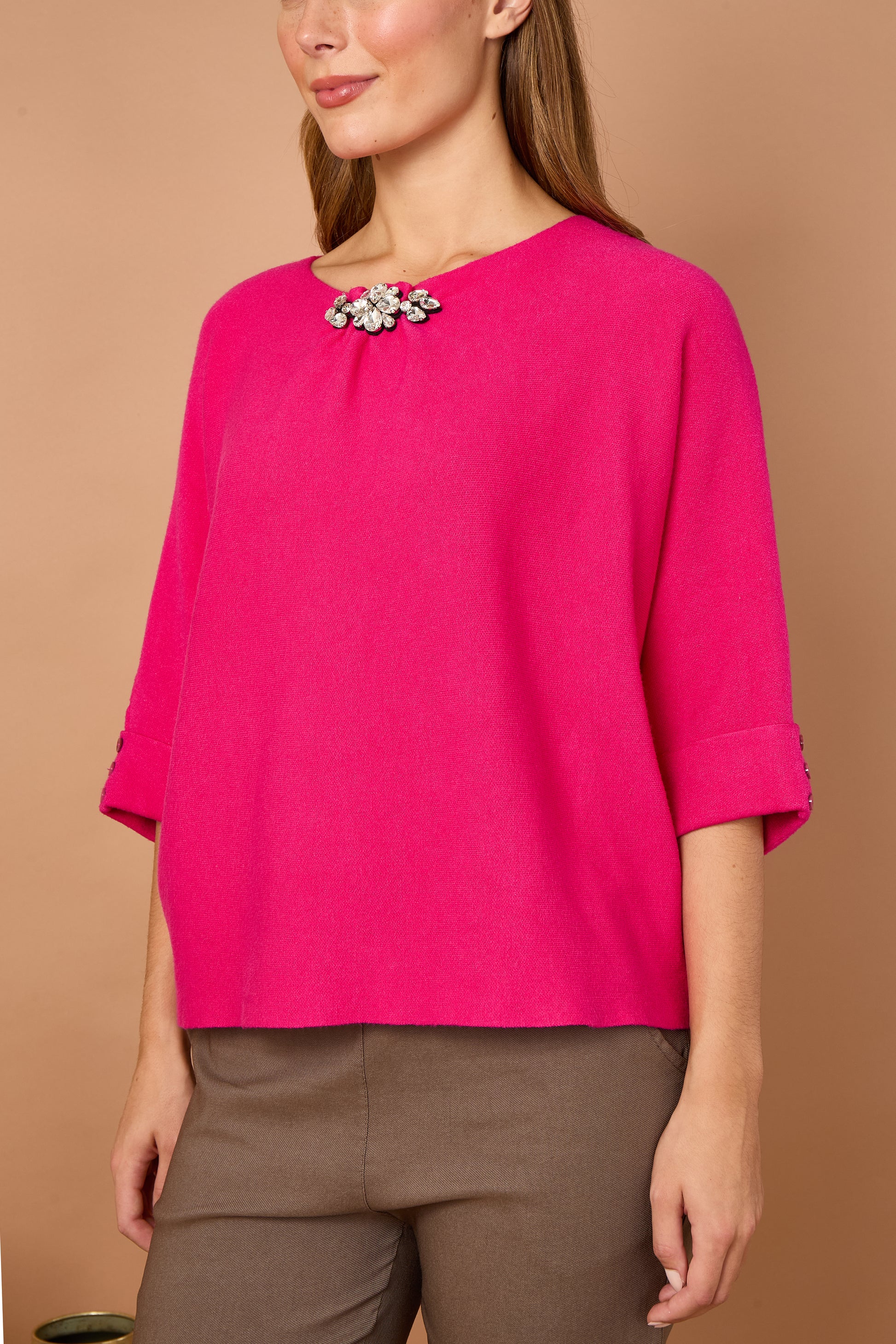 Shine with subtle elegance in the Crystal Neck Fold Sleeve Jumper. Crafted from luxuriously soft knitwear, this jumper features a unique fold-over neckline adorned with delicate crystal embellishments that catch the light with every movement.