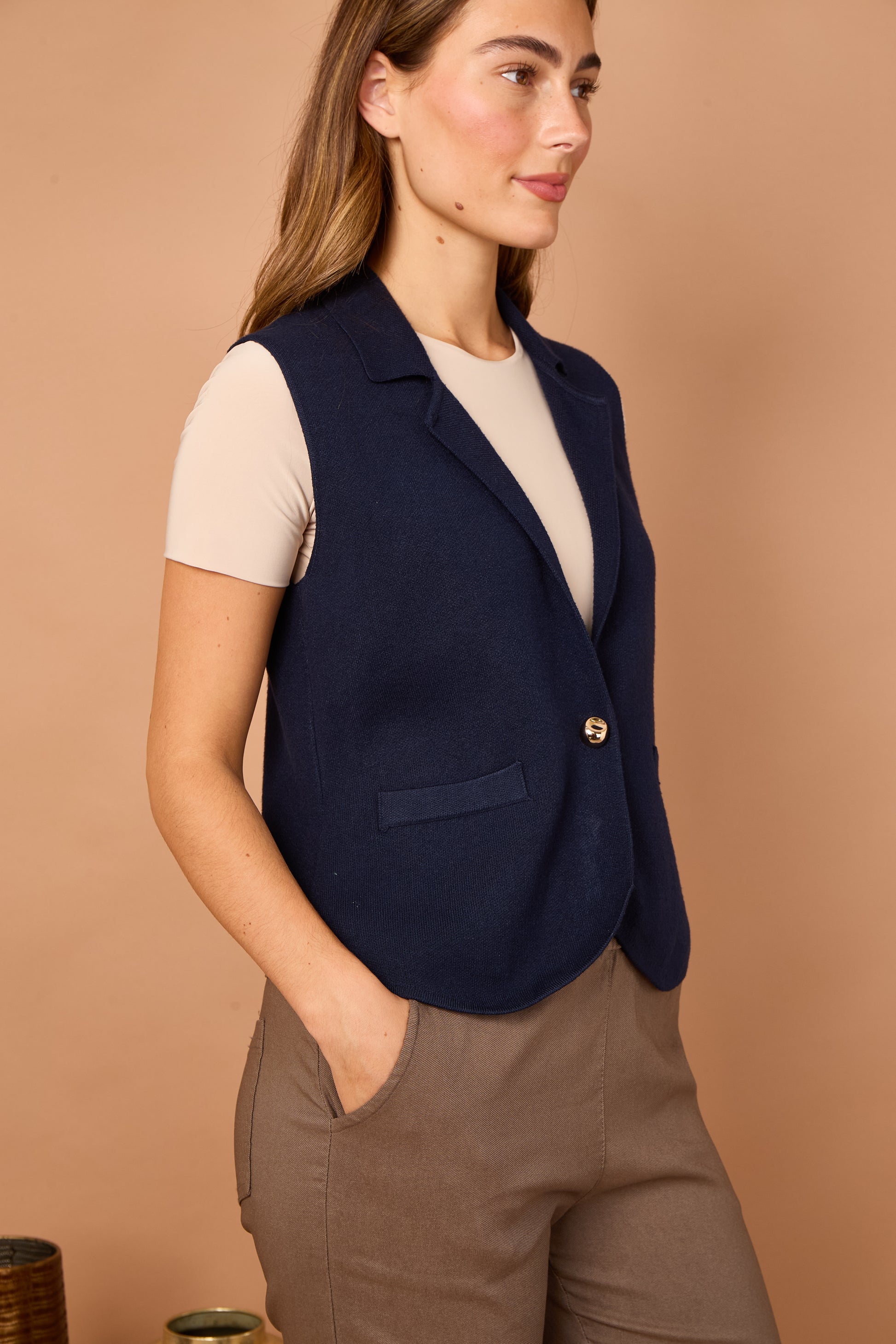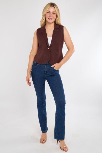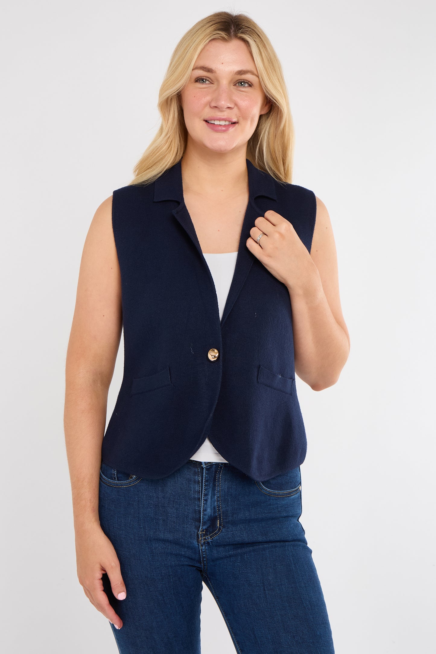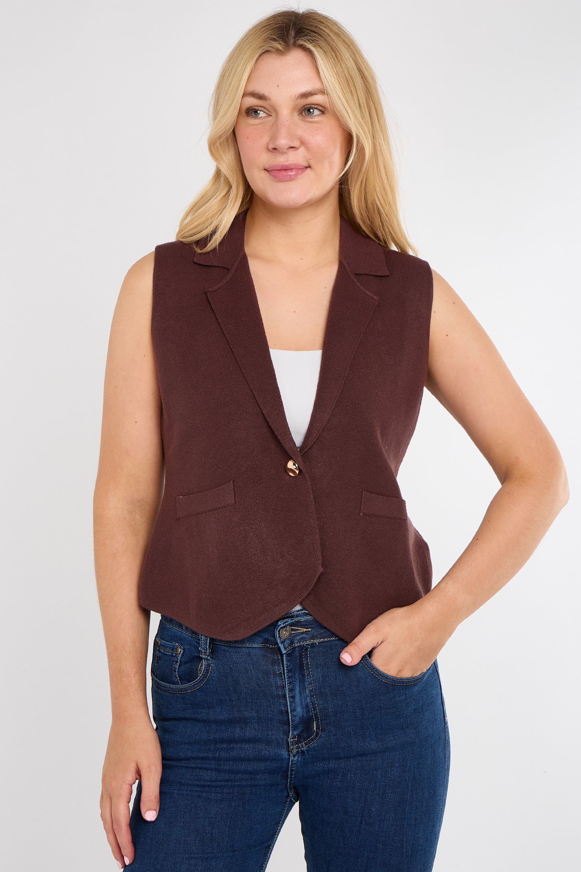 Elevate your layering with the Gold Button Knitted Gilet Blazer — a modern twist on classic tailoring. Crafted from a soft, structured knit, this sleeveless blazer features eye-catching gold buttons that add a touch of luxe sophistication to your outfit.