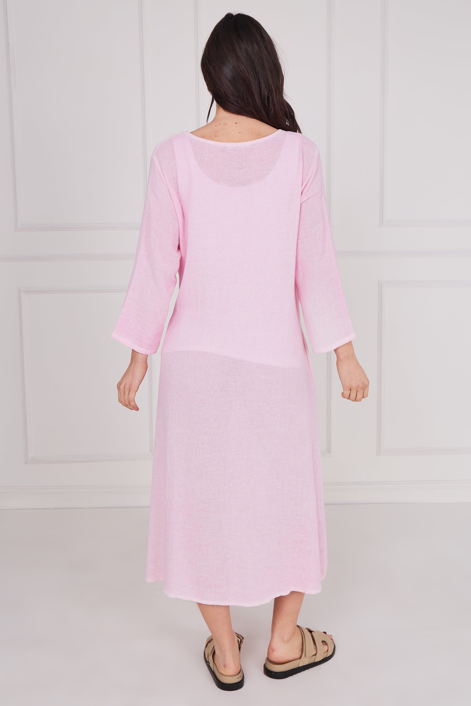 Effortless and breathable, this washed linen dress is designed for relaxed everyday wear. Crafted from soft, pre-washed linen, it offers a naturally textured feel with a gentle drape that improves with every wear. The silhouette is loose and flattering, featuring a subtle V-neckline and three-quarter length sleeves for easy movement.