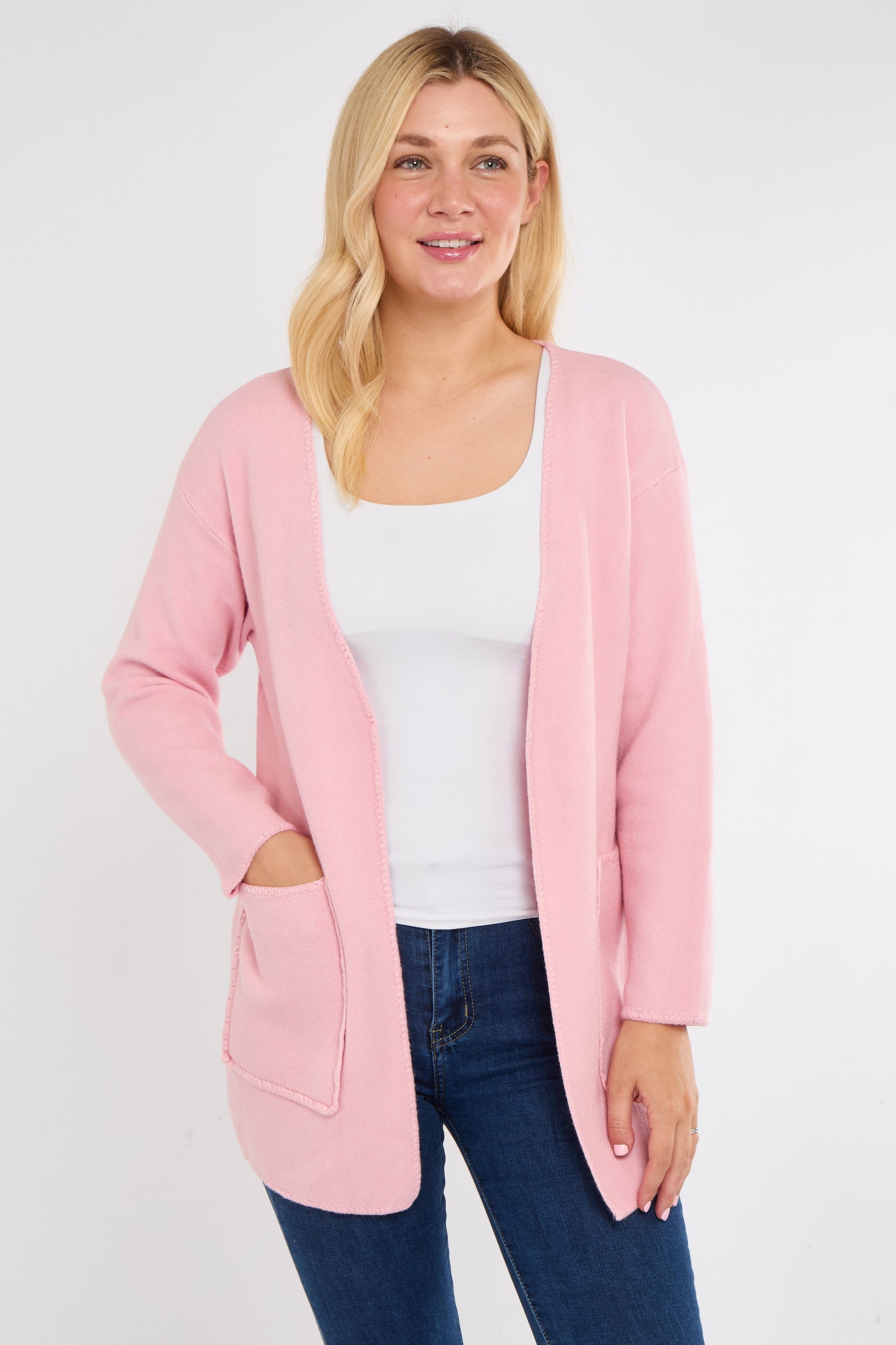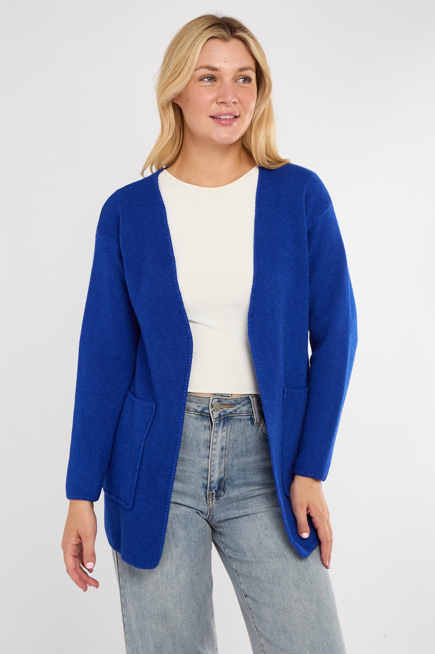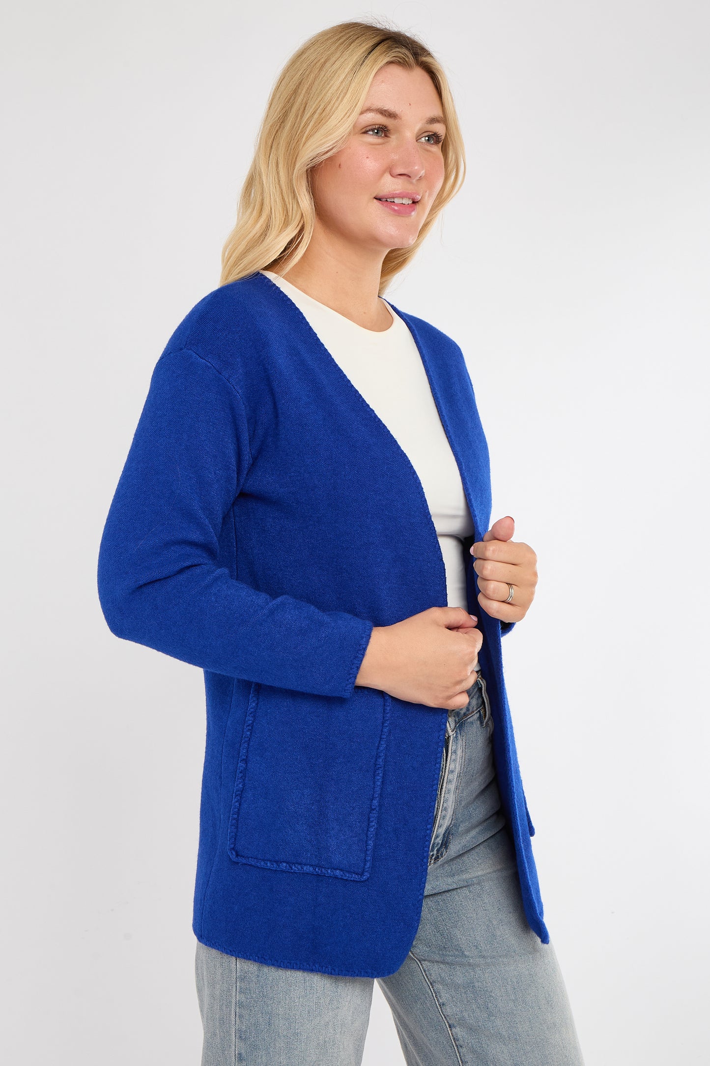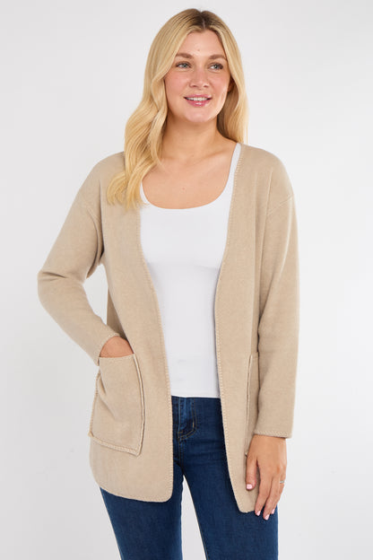 Cozy meets classic in the Blanket Stitch Two Pocket Cardigan. Crafted from soft knit fabric, this cardigan features charming blanket stitch detailing along the edges and two practical front pockets for everyday convenience.