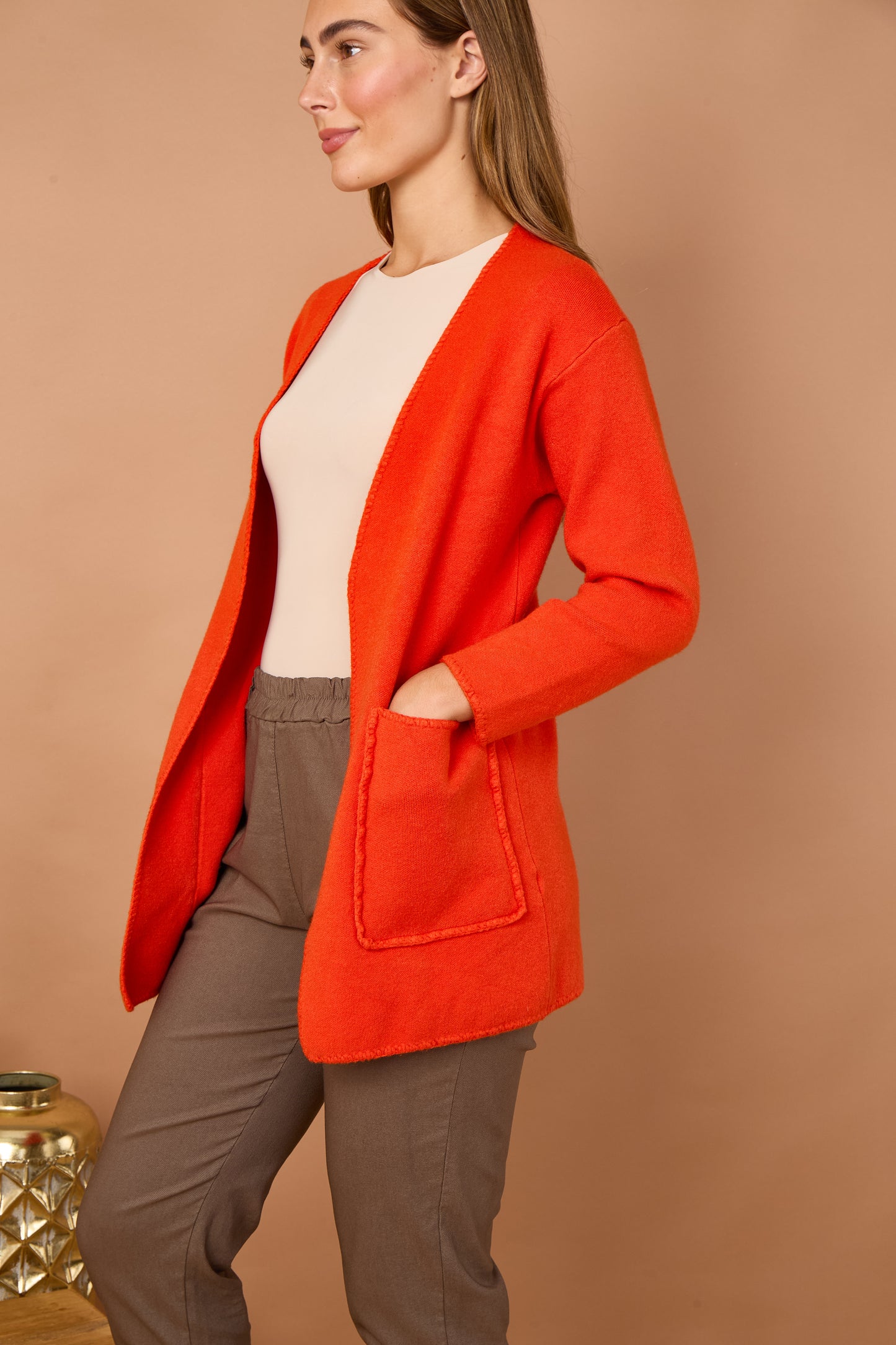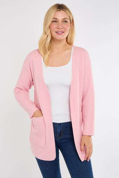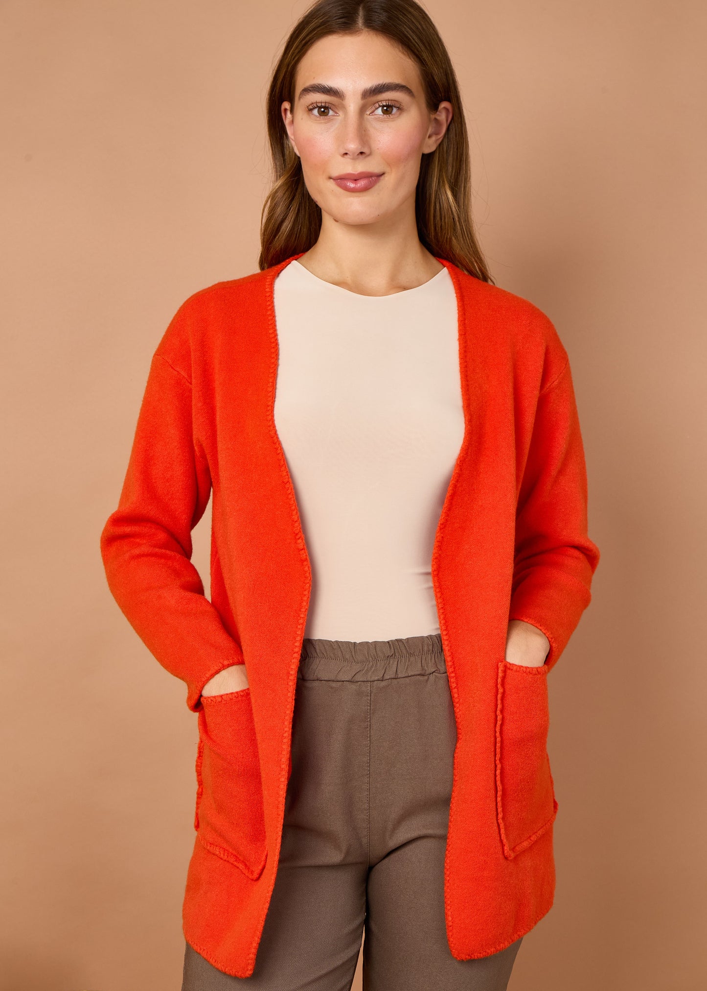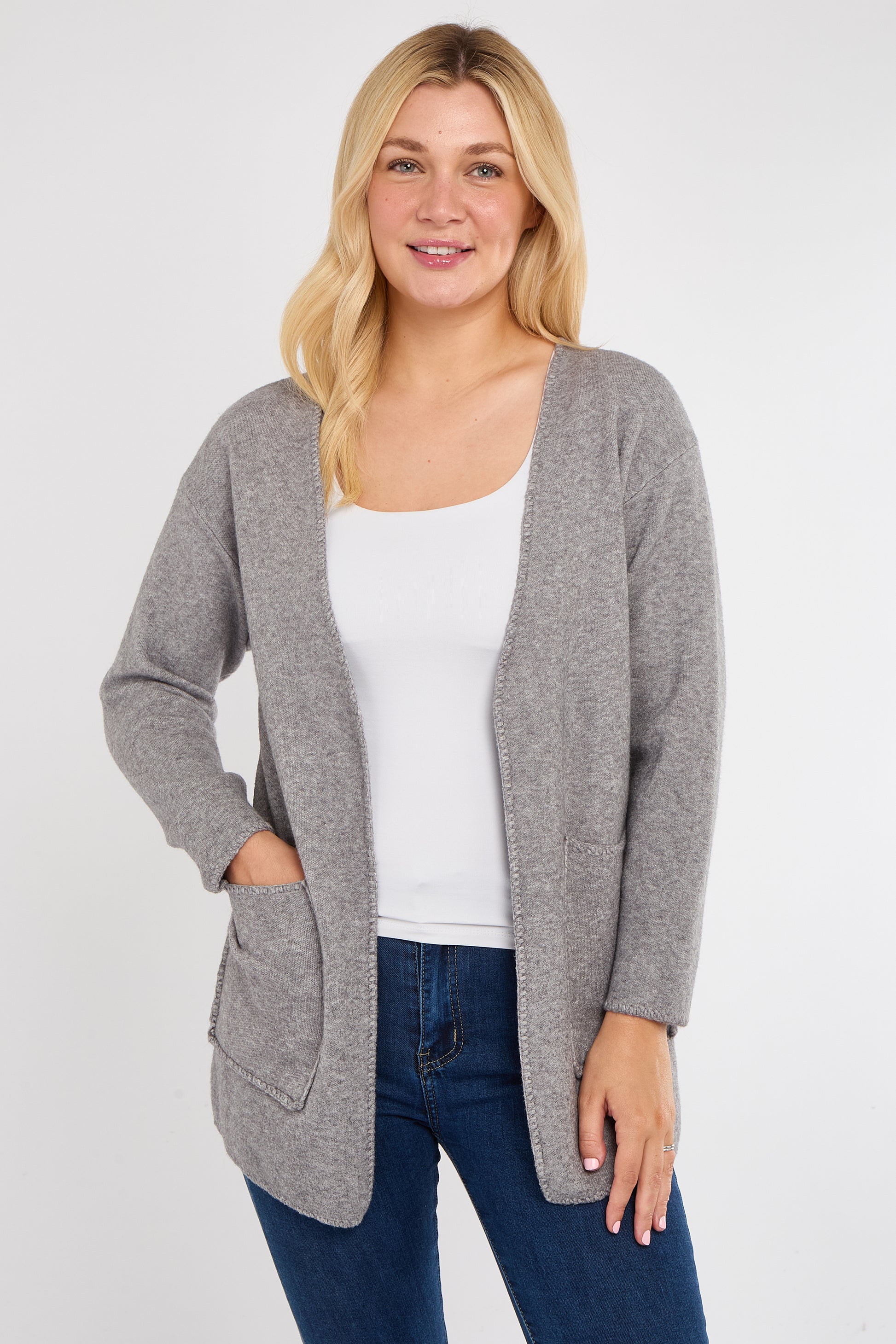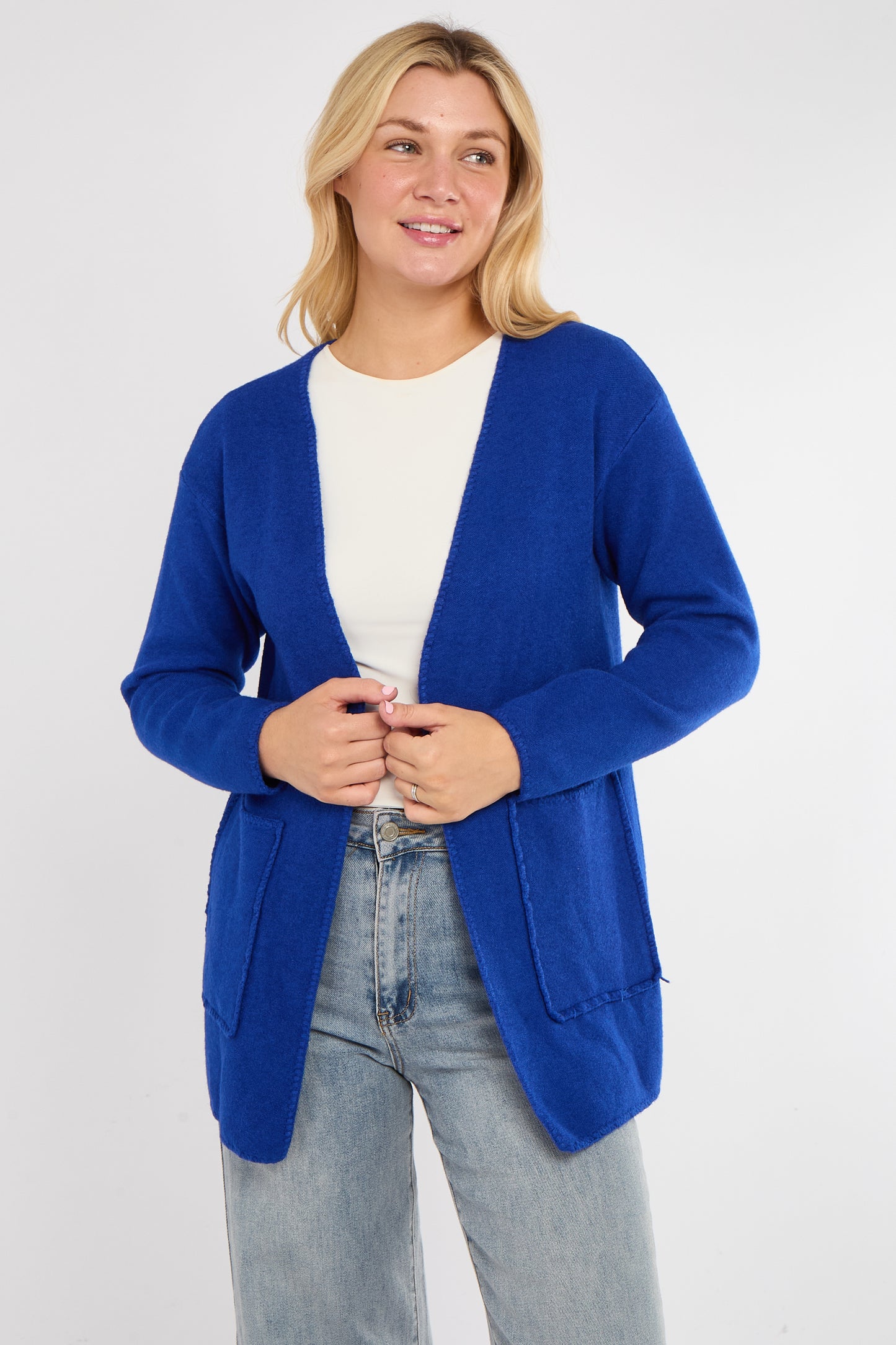 Cozy meets classic in the Blanket Stitch Two Pocket Cardigan. Crafted from soft knit fabric, this cardigan features charming blanket stitch detailing along the edges and two practical front pockets for everyday convenience.