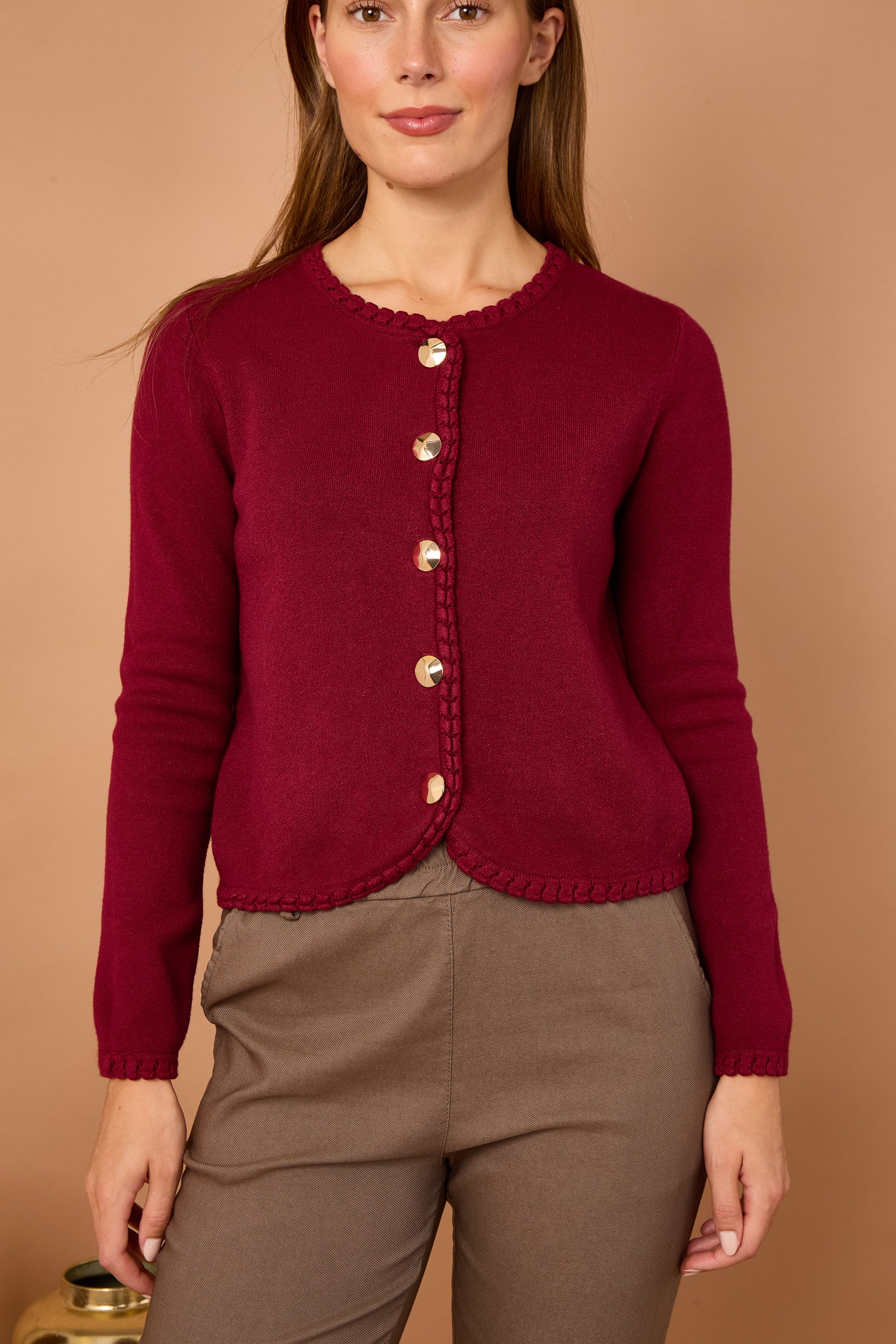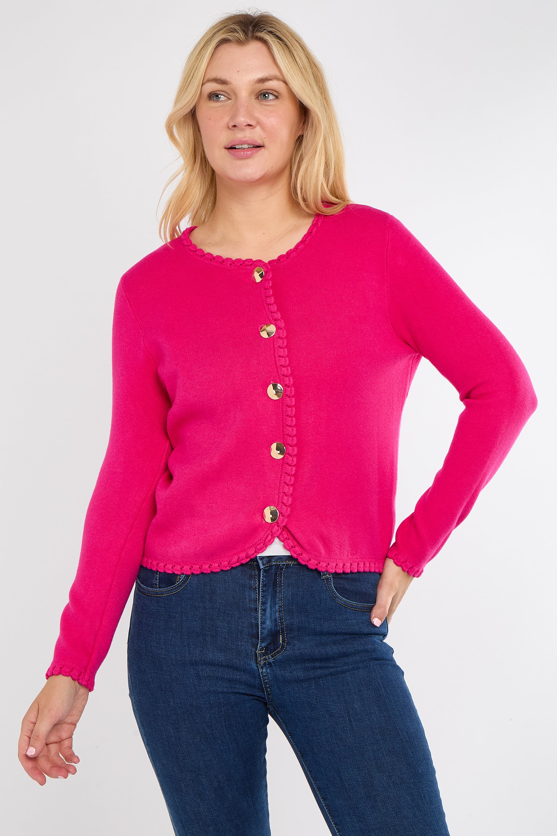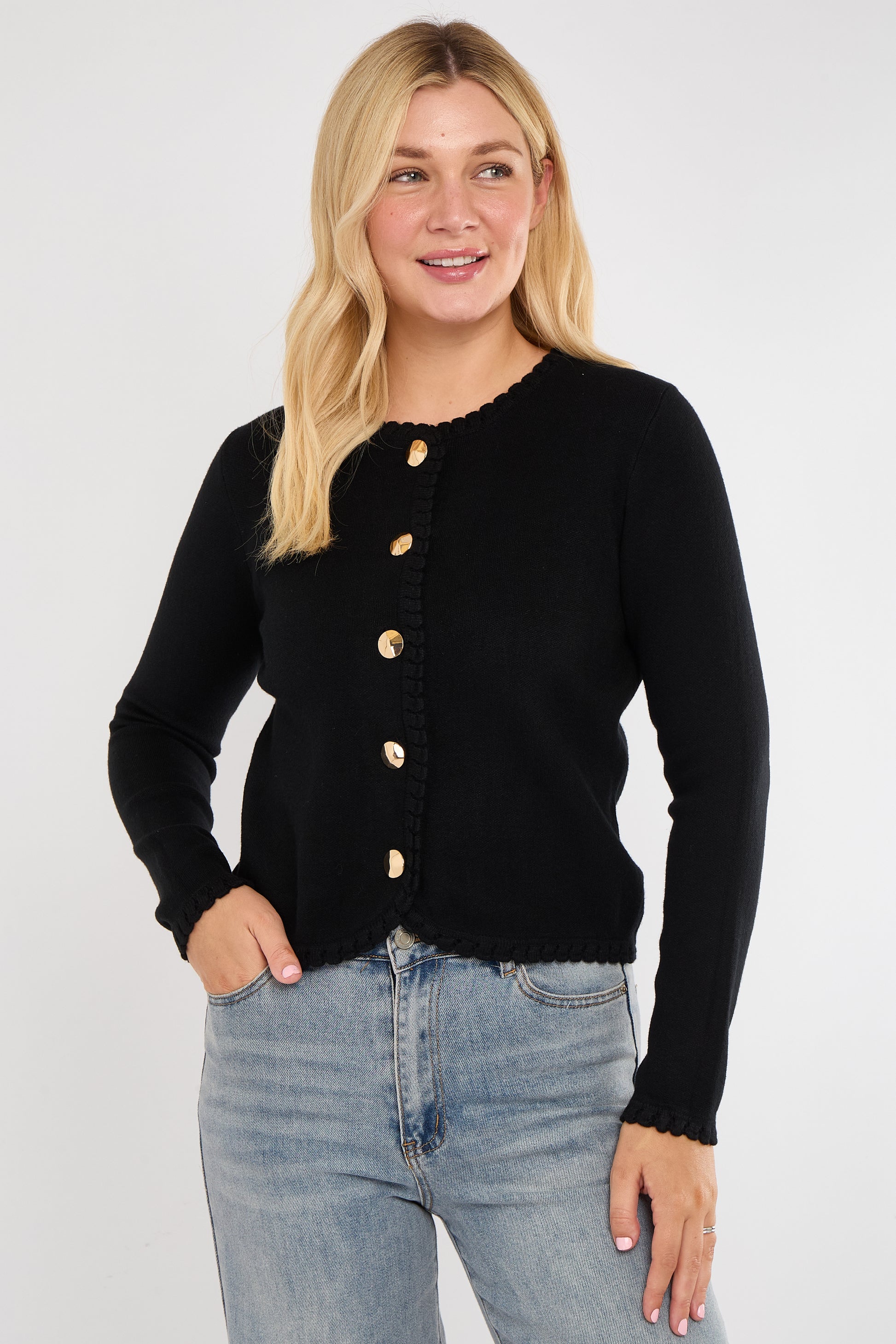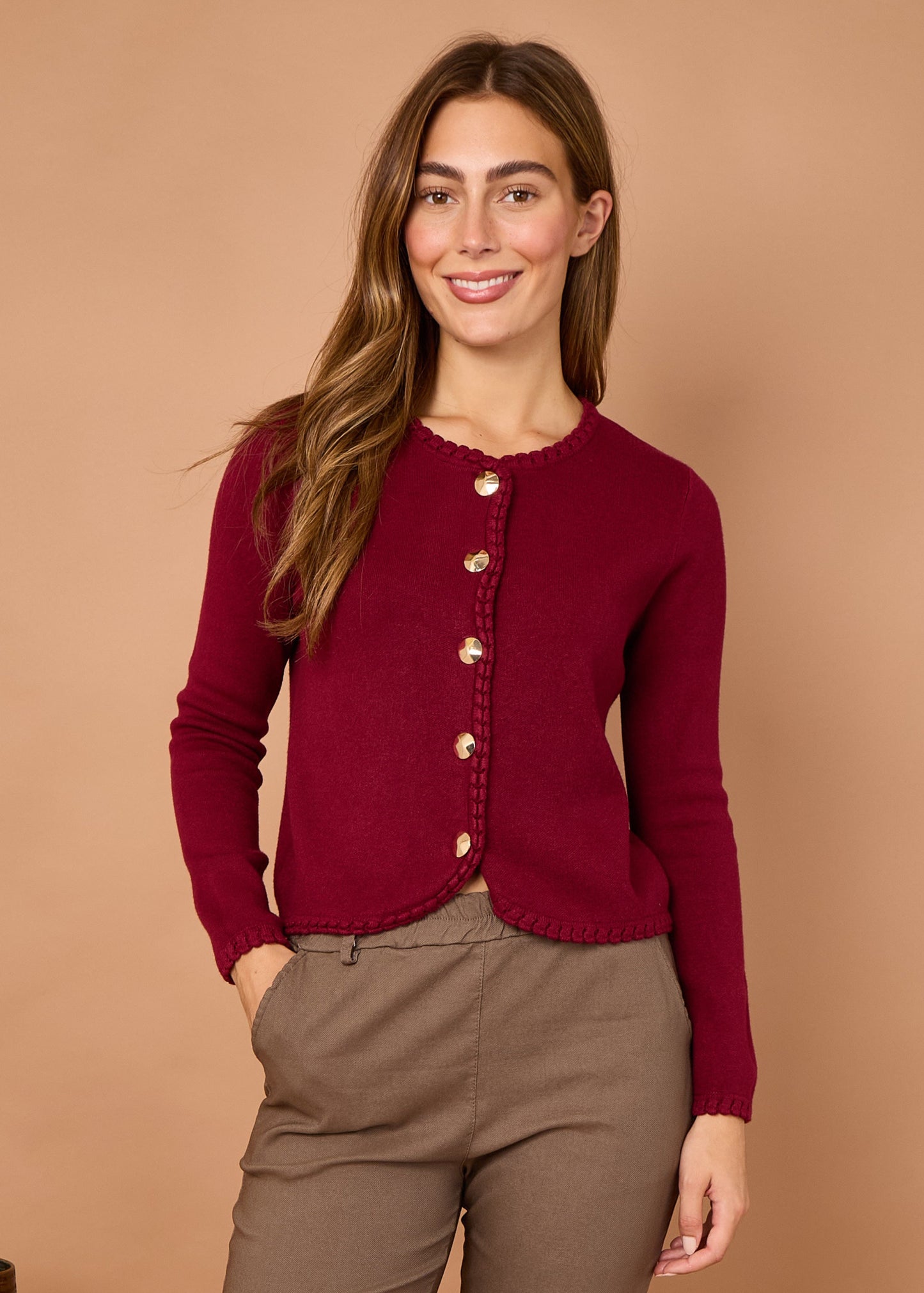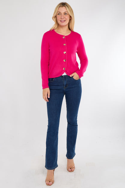Add a touch of classic charm to your wardrobe with the Blanket Stitch Gold Button Cardigan. Crafted from soft, cozy knitwear, this cardigan features elegant blanket stitch detailing along the edges, complemented by striking gold buttons that bring a sophisticated finish.